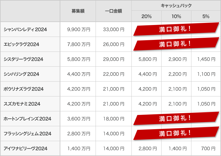 - ラヴズオンリーユー2025への出資口数は本キャッシュバックキャンペーンの対象外であり、対象口数にカウントされません。