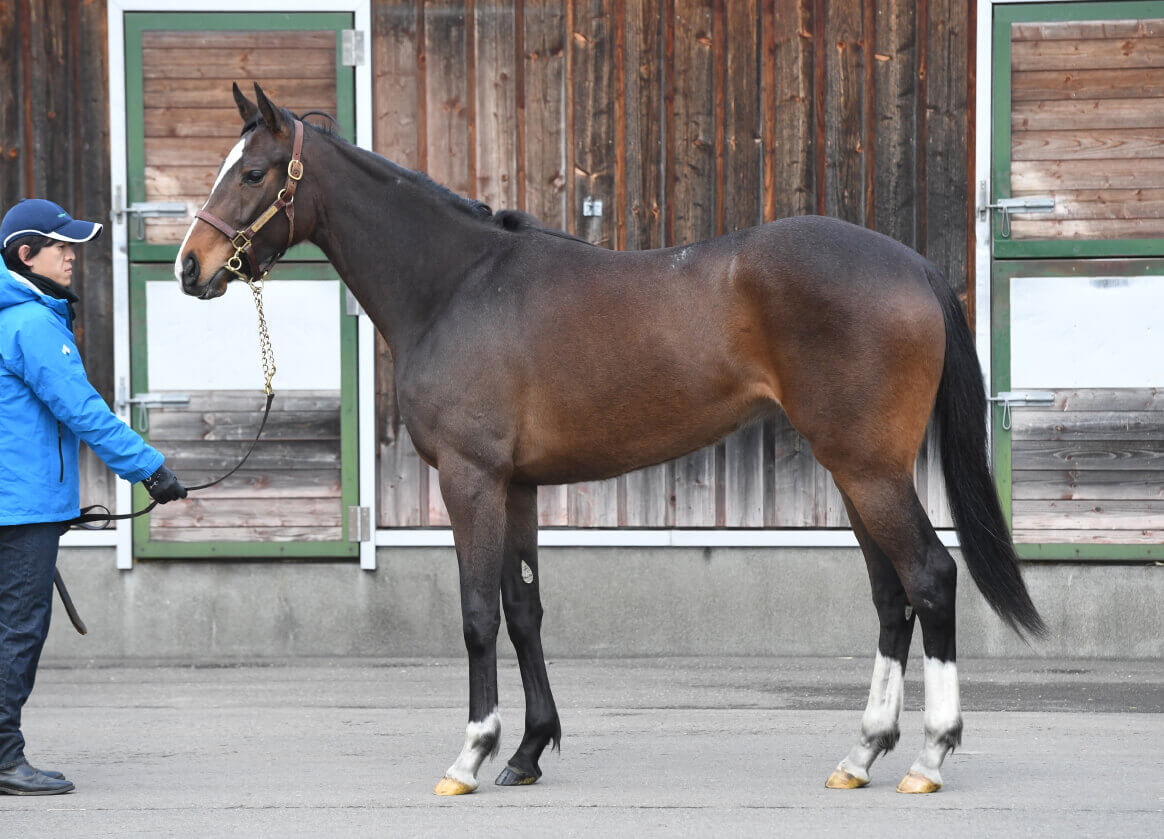 体はひょろっとしているけど幅も出てきて、しっかりとしてきています。あまり大きくはないけど、脚が長くてスラッとしてきれいな、すごくいい形をしていますよ。いいバランスで成長できていると思います。国枝調教師も見に来て、褒めてくれました。今後、屋外馬場が空くと調教もワンランク上がりますし、ゲートもきっちりできますので、いろいろ経験させて移動させたいと思っています。と言っても、遅くとも6月前くらいには移動したい。一度ゲート試験を受けて外厩に出して、再び戻してという流れでも9月の競馬には間に合うのかなと思っています。素軽い走りで切れる脚がありそうなタイプ。楽しみにしています。