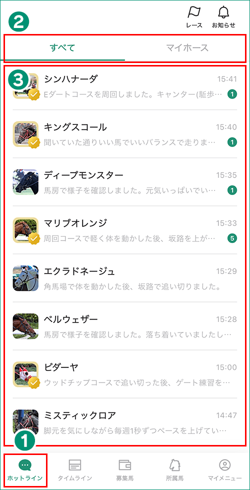 - ホットラインは「すべて」、「マイホース」のタブでそれぞれ検索できます。
